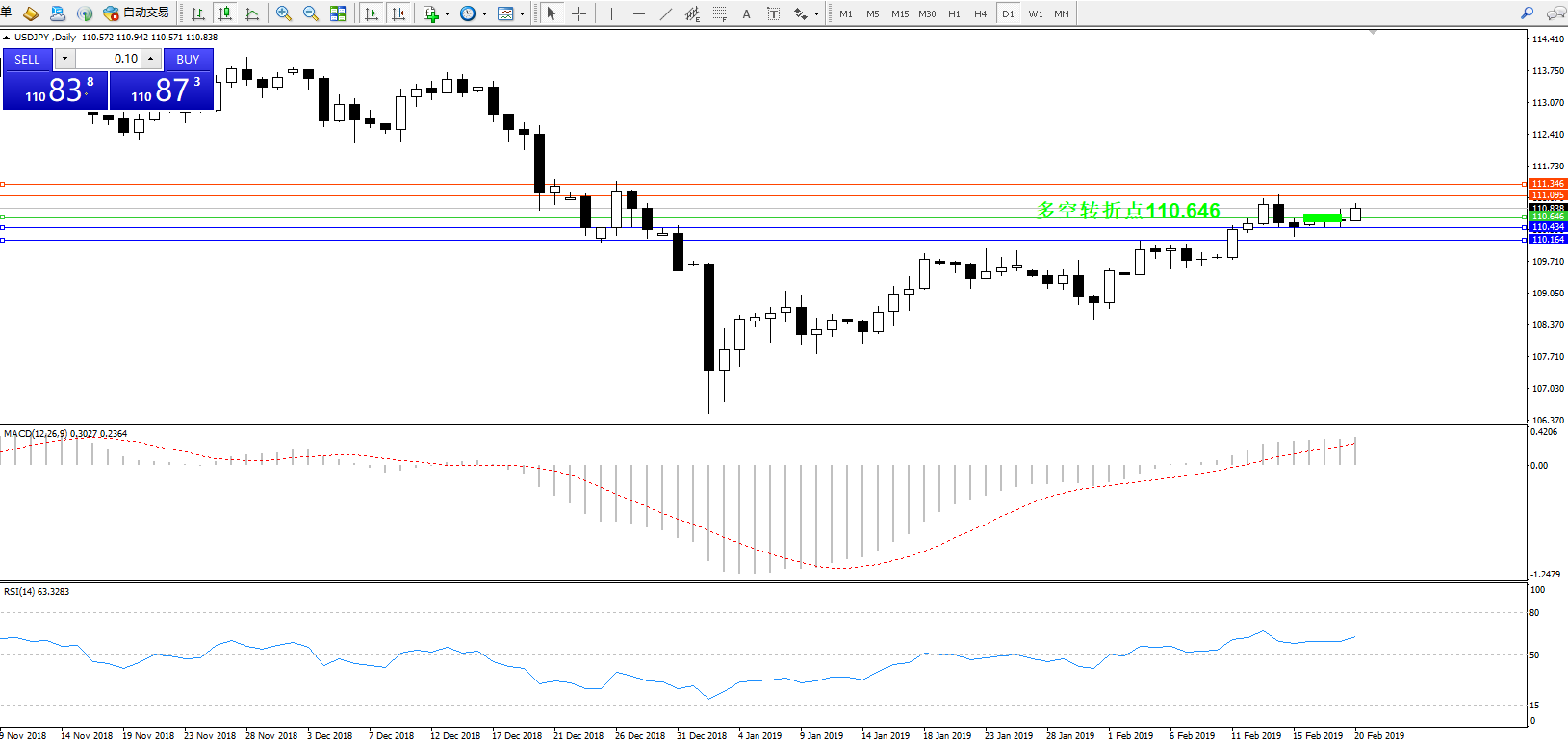 交易策略:110.646上方看涨,目标111.095、111.346