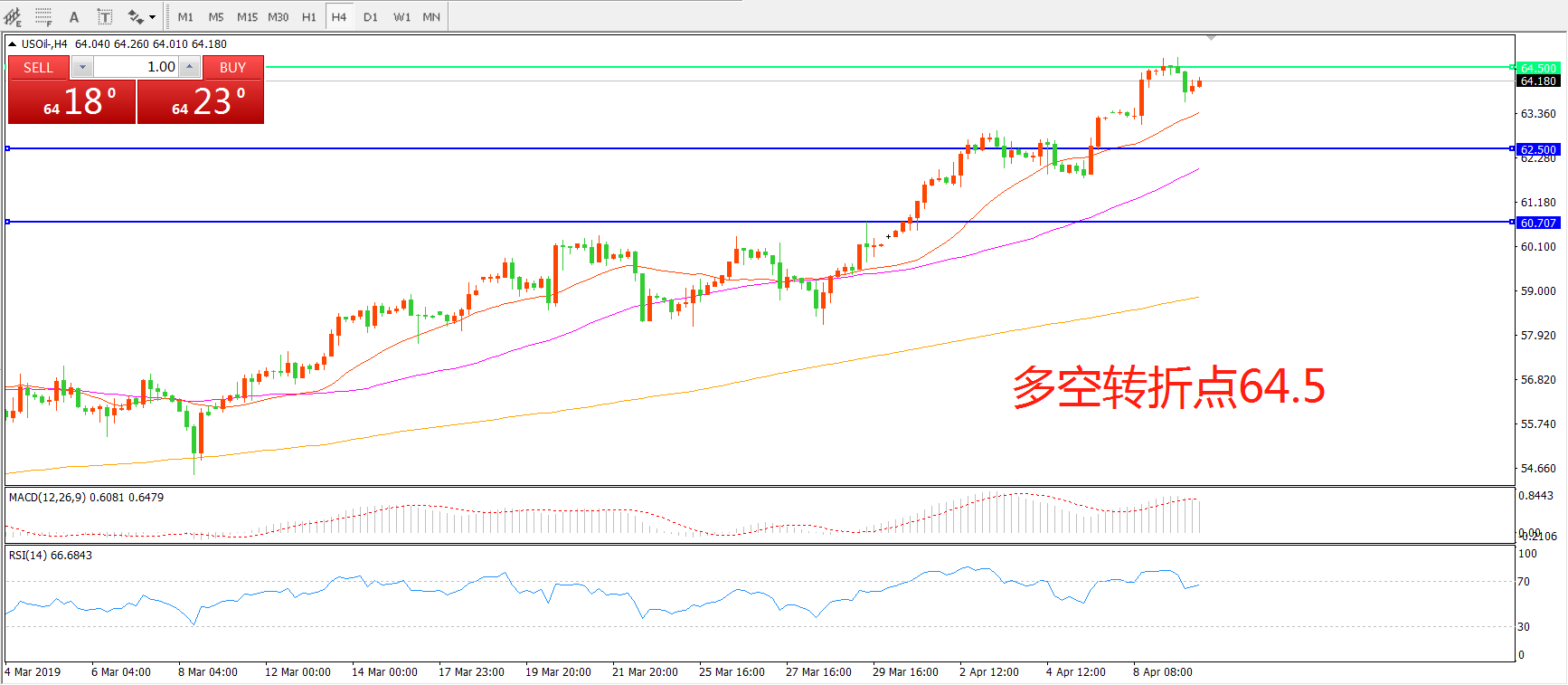 4小时图看,油价突破62.5美金后阳线连续拉升,虽触碰上方阻力后有所回落,但短期走势依然偏强,均线系统呈多头排列,MACD红柱增加,RSI指标走平,日内延续上行概率较大。