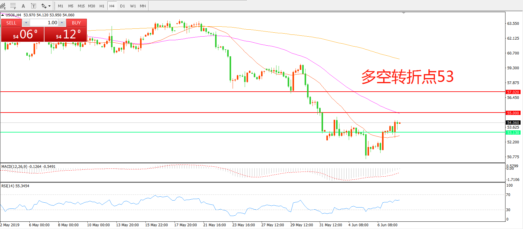 4小时图看,油价低位震荡后长阳反弹,突破53一线阻力后摆脱下行走势,短期均线有拐头迹象, MACD绿柱减少,RSI指标有拐头向上,日内仍重点关注55附近阻力。