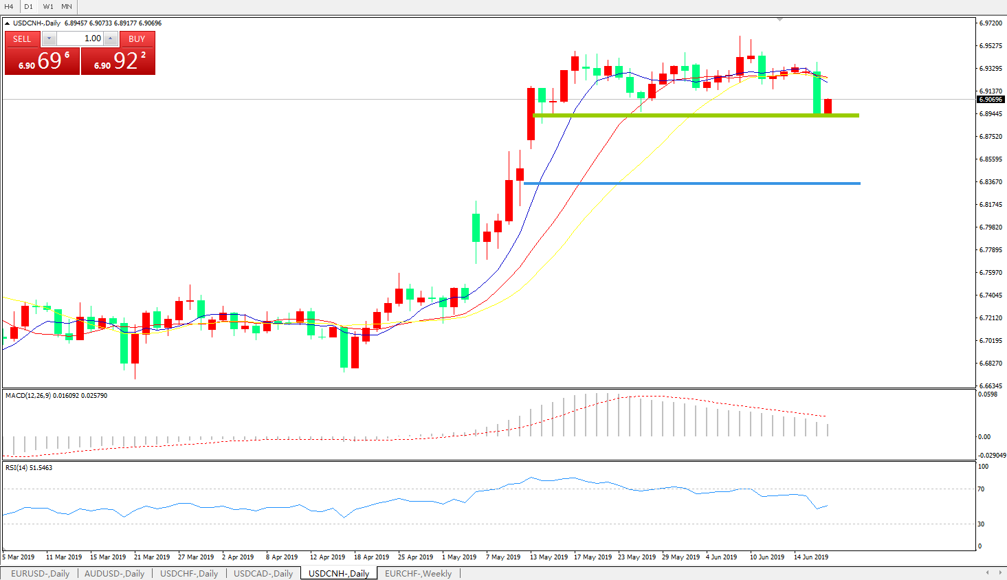 技术面简析:日线图均线有发散下行迹象,MACD在0轴上方向下运行且动能柱持续缩量,RSI逐步走低,预计短期汇价有继续回落需求,贸易争端缓解及G20是目前焦点,需持续关注。