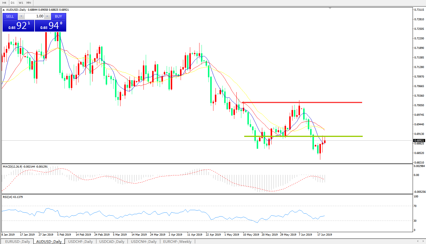 技术面简析:日图均线有序空头排列看跌,价格反弹但较为乏力,MACD在0轴下方运行且动能放量,RSI轻微反弹,汇价在贸易战及美联储货币政策影响下小幅反弹,但中期依旧考虑逢高做空。