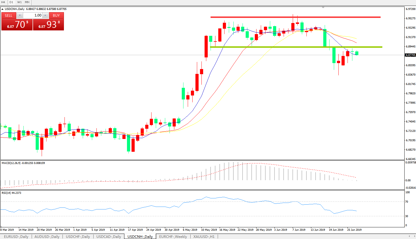 技术面简析:日线呈有序空头排列MACD逼近0轴且动能柱绿柱放量RSI开始反弹后再度走弱,贸易争端缓解预期犹在,G20临近,预计汇价大概率将进一步走低