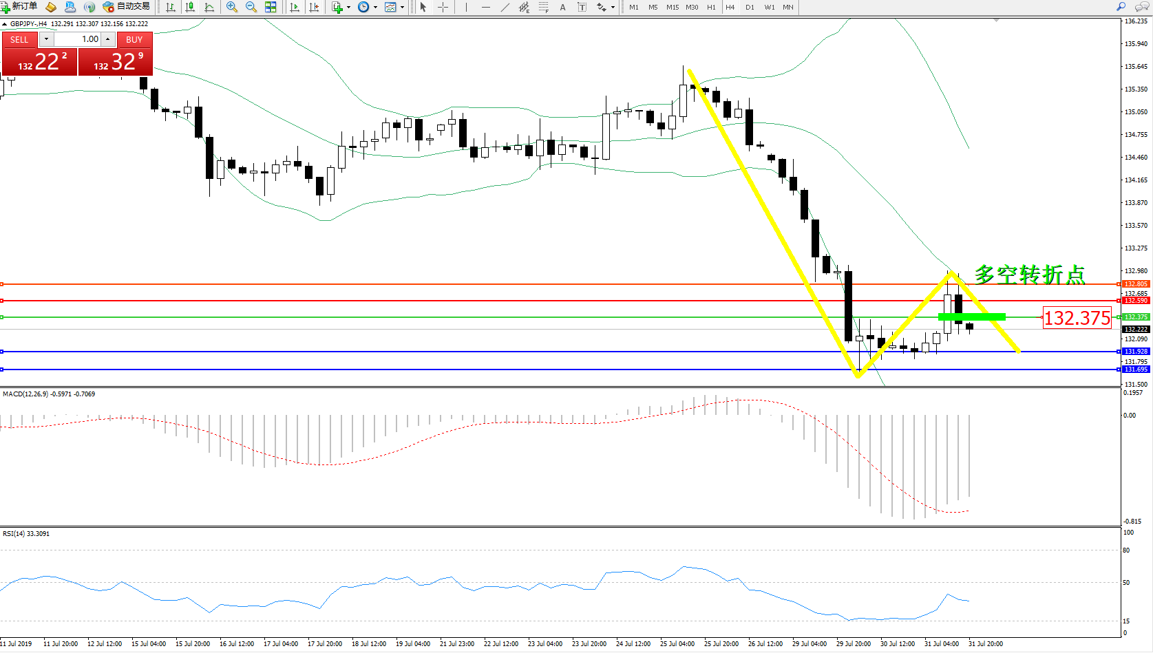 交易策略:132.375下方看跌,目标131.928、131.695