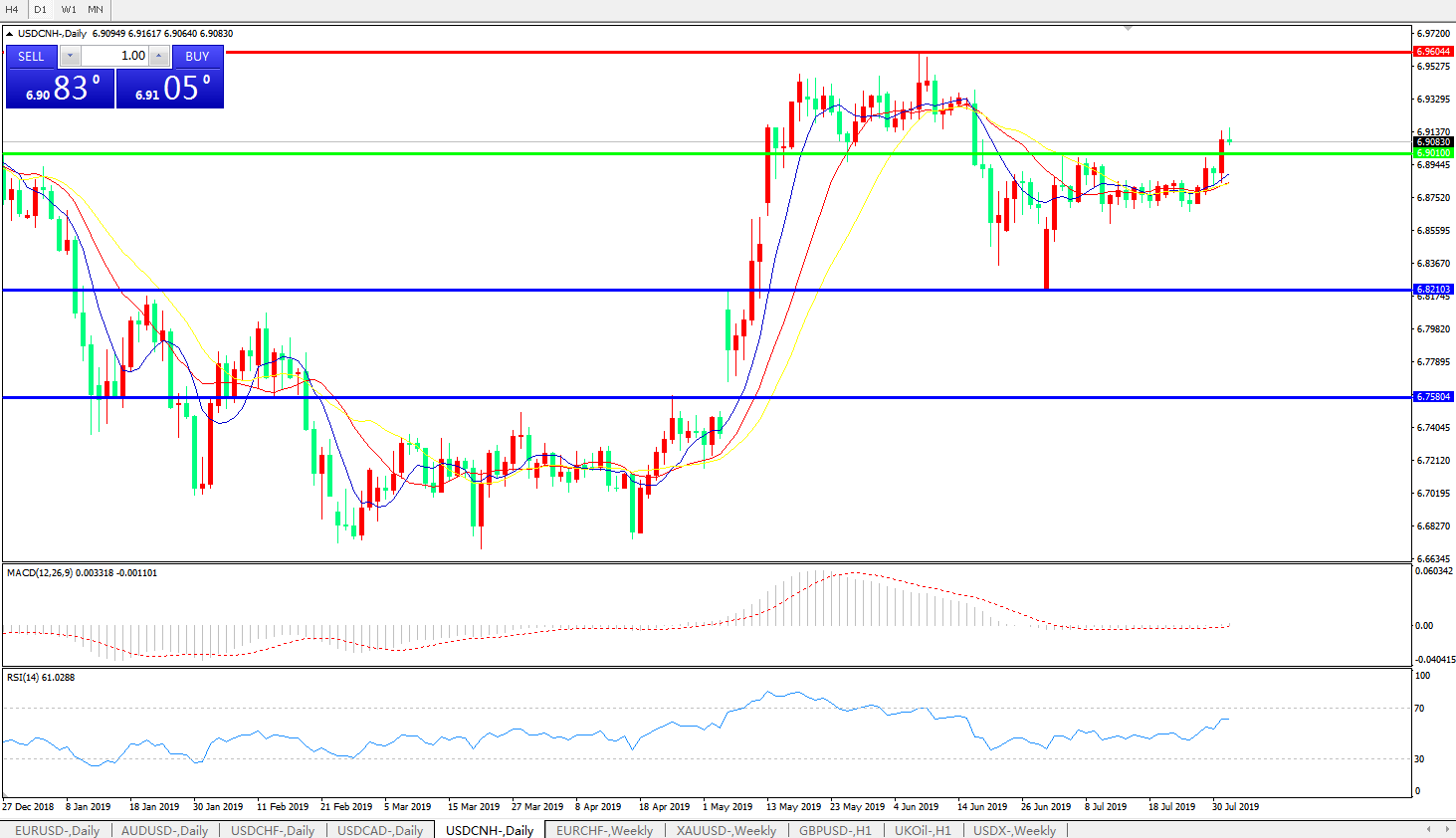 备选策略: 在6.9010之下,看跌,目标价位为6.8210,然后为6.7580。