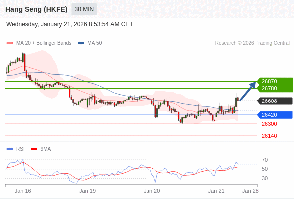 在 26420 之上,看涨,目标价位为 26780 ,然后为 26870 。