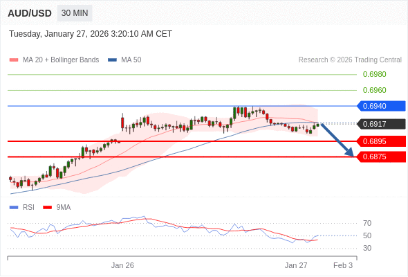 在 0.6940 之下,看跌,目标价位为 0.6895 ,然后为 0.6875 。