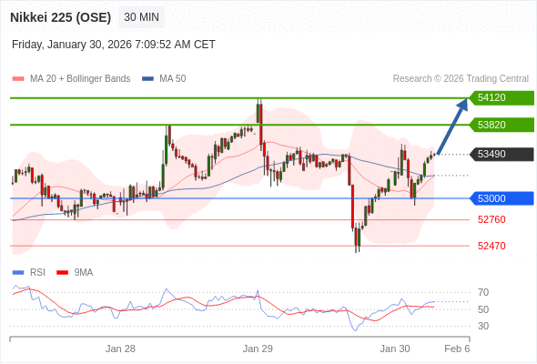 在 53000 之上,看涨,目标价位为 53820 ,然后为 54120 。