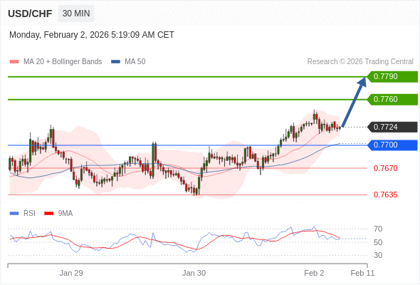 在 0.7700 之上,看涨,目标价位为 0.7760 ,然后为 0.7790 。