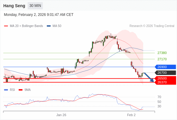 恒生指数 当日内: 短期关键阻力位在26900。