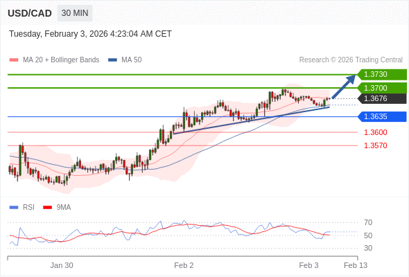 在 1.3635 之上,看涨,目标价位为 1.3700 ,然后为 1.3730 。