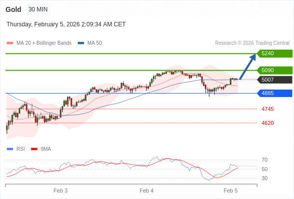 交易策略: 在 4885 之上,看涨,目标价位为 5090 ,然后为 5240 。