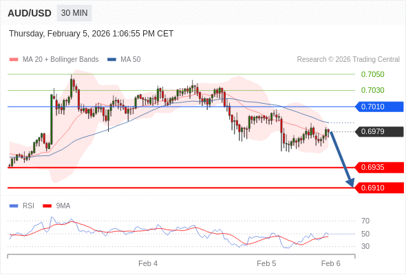 在 0.7010 之下,看跌,目标价位为 0.6935 ,然后为 0.6910 。