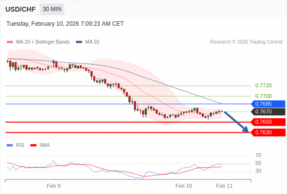 美元/瑞郎 当日内: 短期关键阻力位在0.7685。