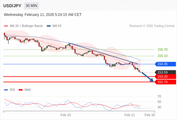 在 154.35 之下,看跌,目标价位为 153.20 ,然后为 152.70 。