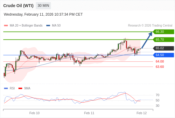 在 64.50 之上,看涨,目标价位为 65.70 ,然后为 66.30 。