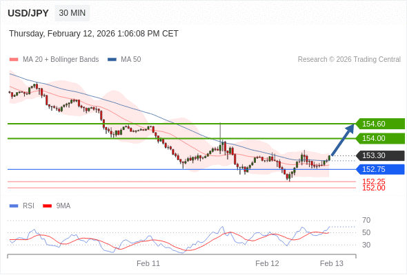 在 152.75 之上,看涨,目标价位为 154.00 ,然后为 154.60 。