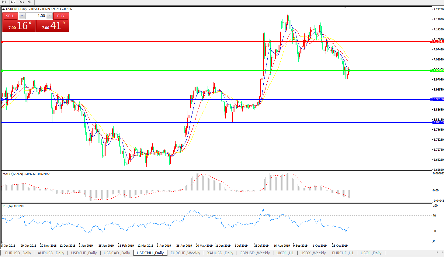 交易策略: 在7.0000之下,看跌,目标价位为6.9010,然后为6.8210。