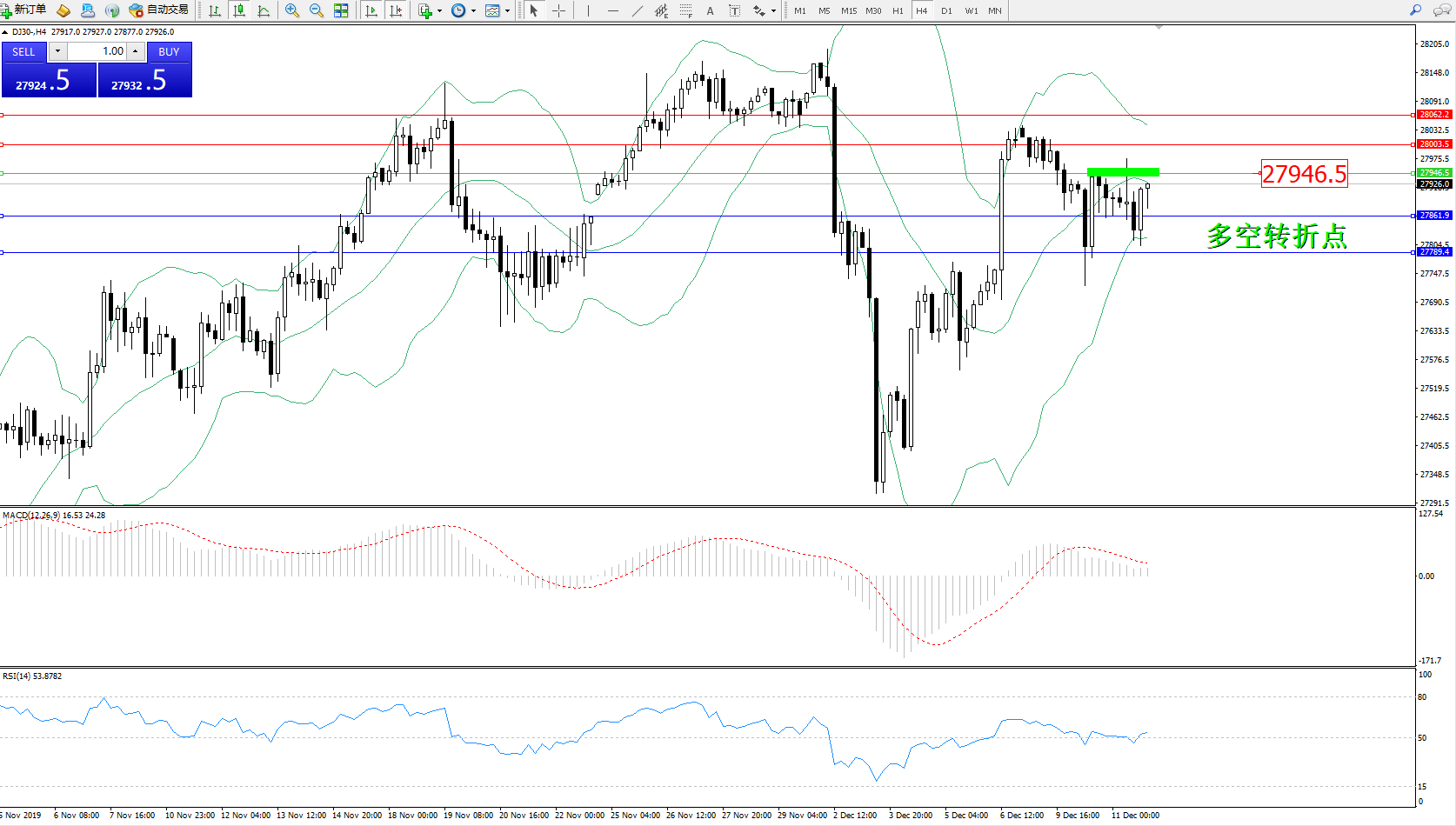 道琼斯指数DJ30—— 4小时K线图显示: