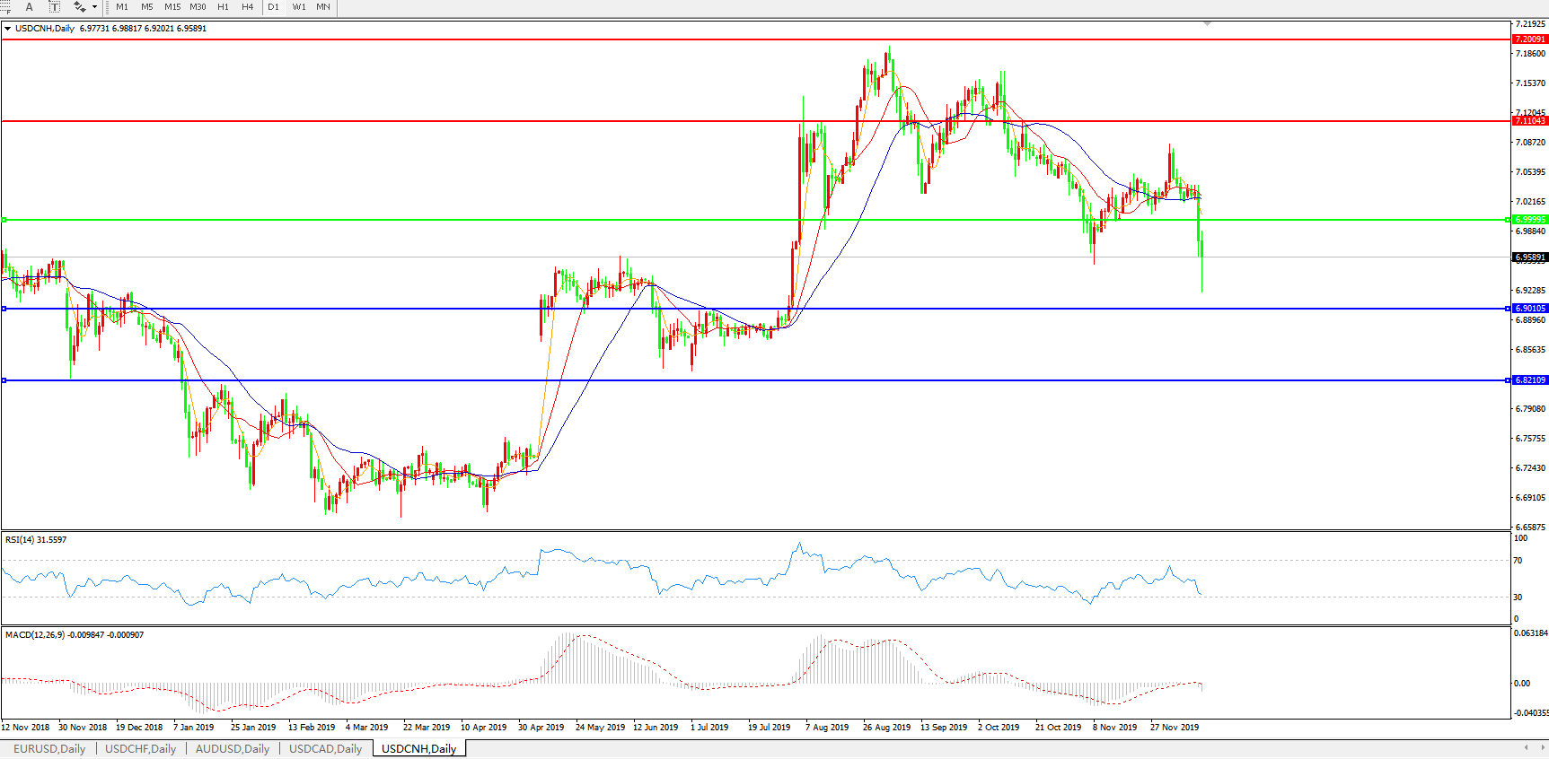 技术面简析:日图均线呈有序空头排列,汇价骤跌破7.0关口,MACD自0轴附近快速走低且量能0轴下方快速放量,RSI骤跌走低,预计短期汇价将在进一步下行。