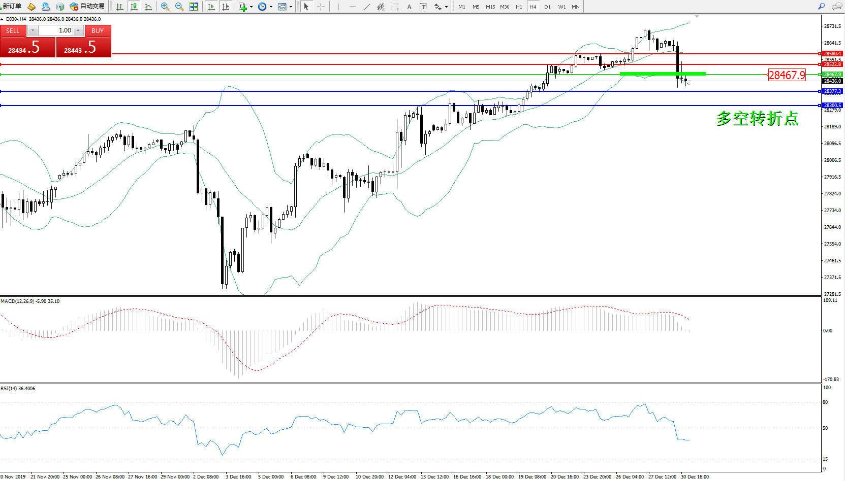 技术点评:多头动力延续布林带指标中上轨不断创新高后,高位终于迎来空头下行走势,高位回撤态势良好,有跌破布林带指标下轨态势,且处于张口走势中,MACD指标处于多头区域高位整理下移至0轴线附近有迹象下行态势,RSI指标跌破50均衡线继续下挫至空头区域整理平移中;