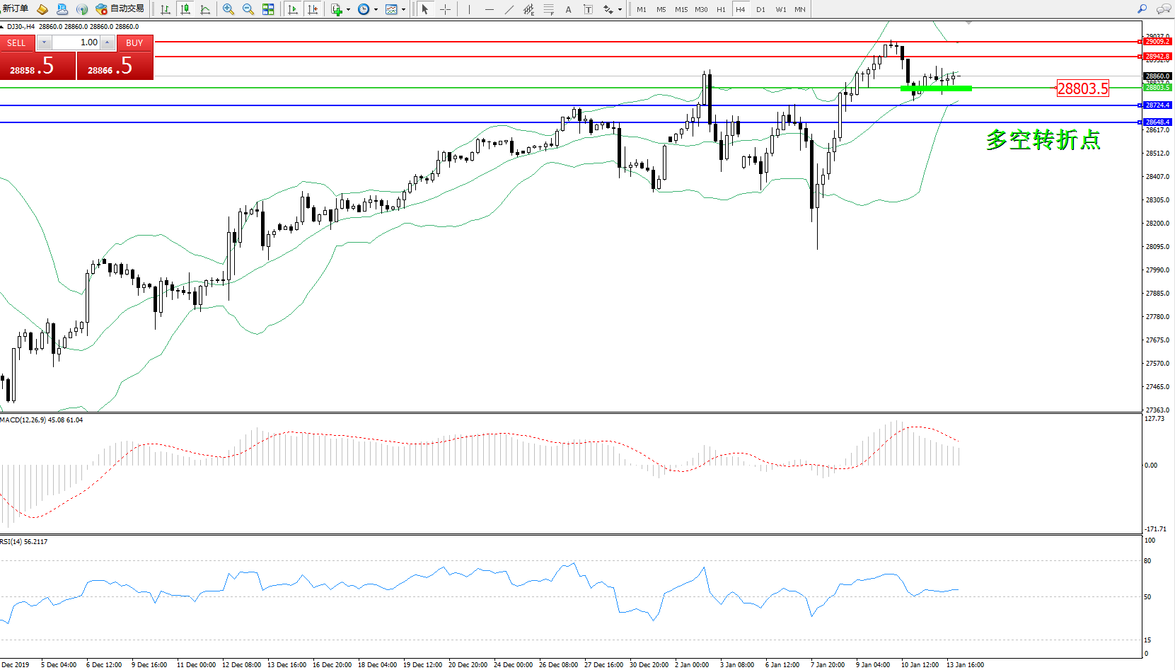 道琼斯指数DJ30—— 4小时K线图显示: