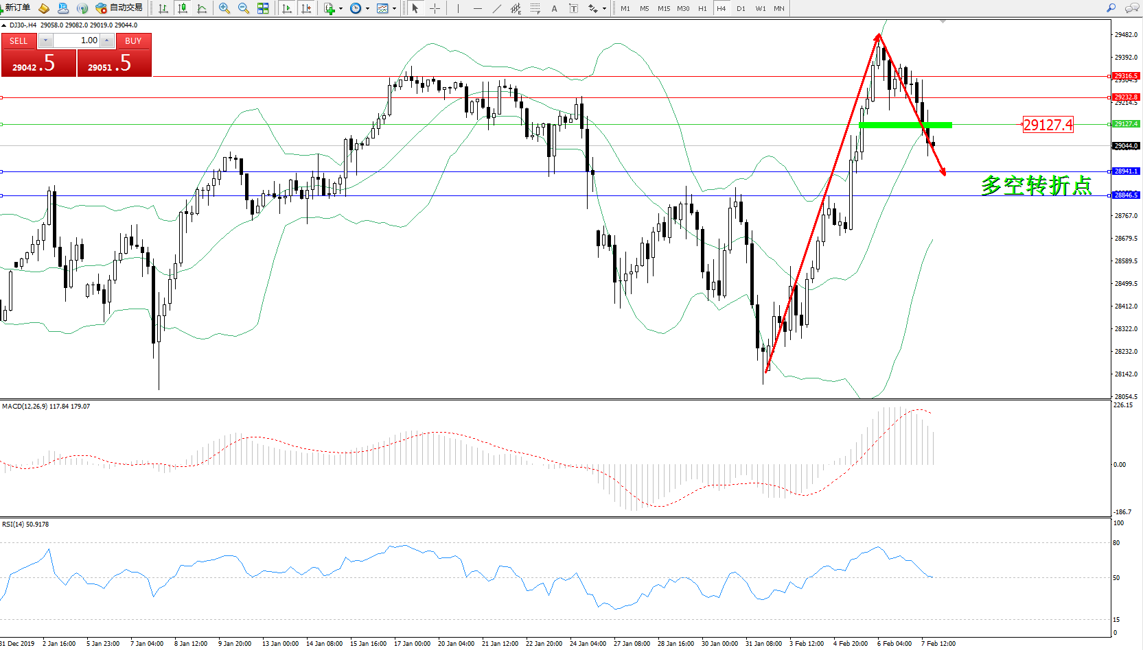 道琼斯指数DJ30—— 4小时K线图显示: