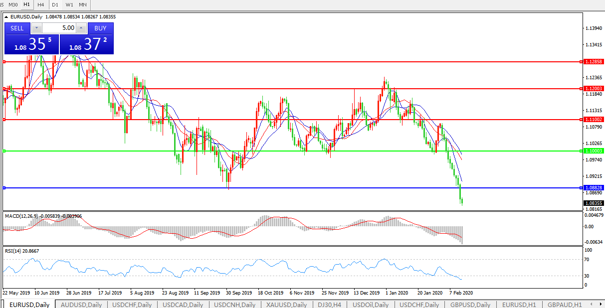 欧元兑美元在周四欧洲时段午盘再度跳跌,日内低点1.0854亦为自2017年5月以来近33个月新低,尽管日内稍早在美元指数回落的带动下欧元汇价短时反弹,但这只不过是“死猫跳”式的技术调整,在风险偏好格局未有根本改变的背景下,欧元跌势旋即重启;投资者对美欧经济落差拉大的状况正予以更密切关注,而日内基本面最新消息也显示全球公共卫生风险事件对于欧元区部分经济体本已脆弱的现状或造成雪上加霜的打击,更令投资者抛售欧元计价资产;市场正在等待此后的美国CPI数据一锤定音; 而跌破2017年4月24日开盘点位1.0859的状况,也意味着欧元兑美元已开始正式回补当时因为法国总统马克龙胜选而录得的逾百点跳空缺口,这意味着汇价之后的下行目标位将下看1.0821和1.0778。该缺口一旦被补上,汇价可能继续探底至1.05水平。