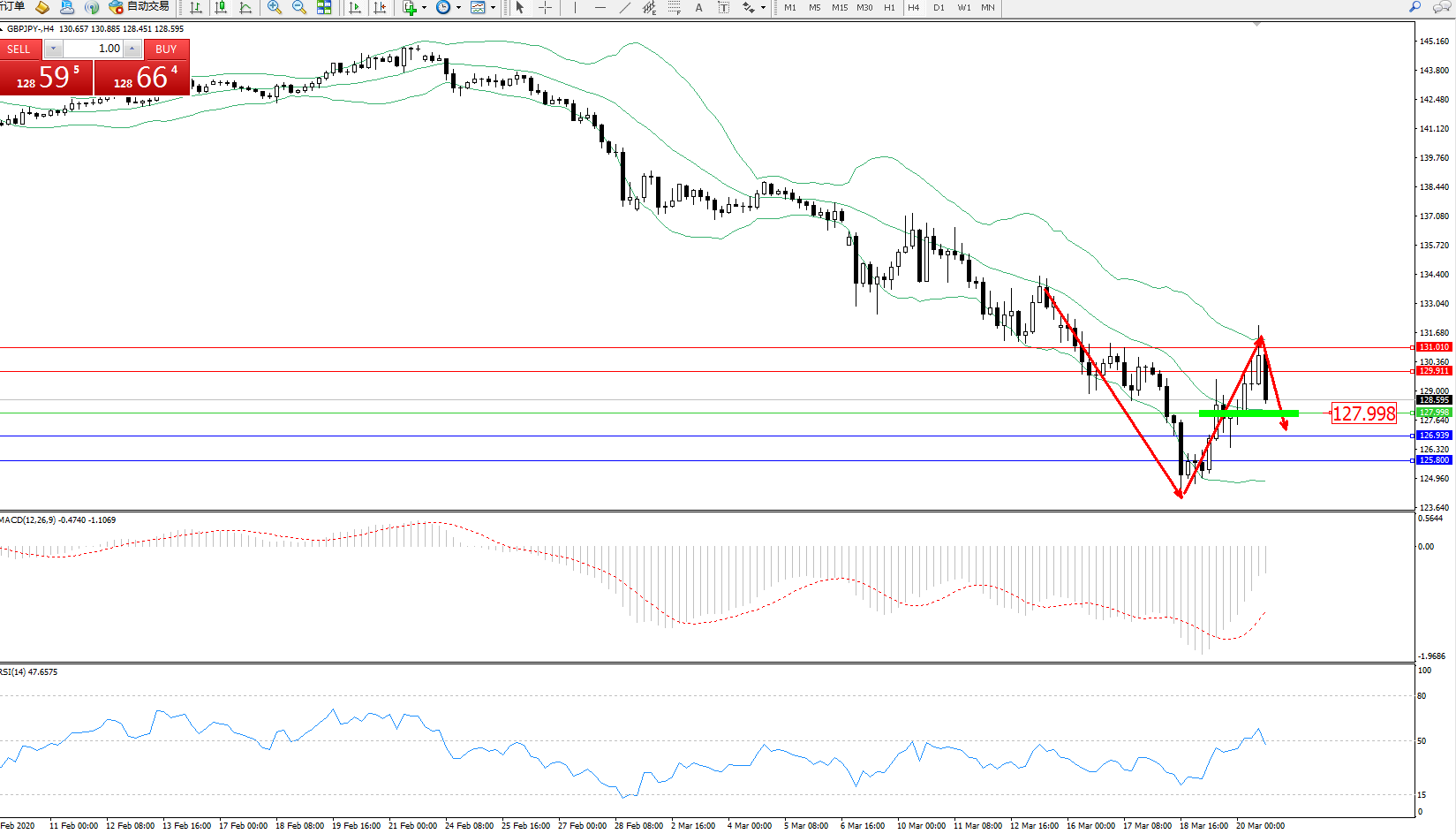 备选策略:127.998下方看跌,目标126.939、125.800