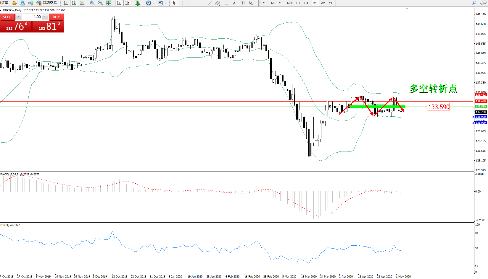 交易策略:133.590下方看跌,目标131.960131.029