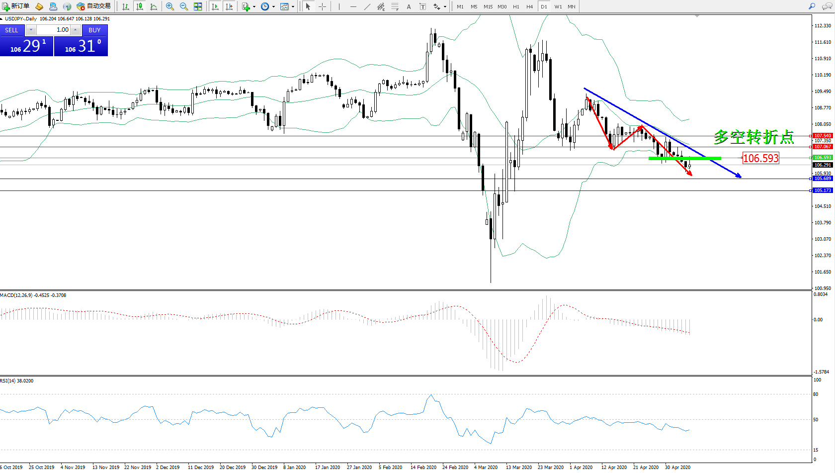 交易策略:106.593下方看跌,目标105.689、105.173