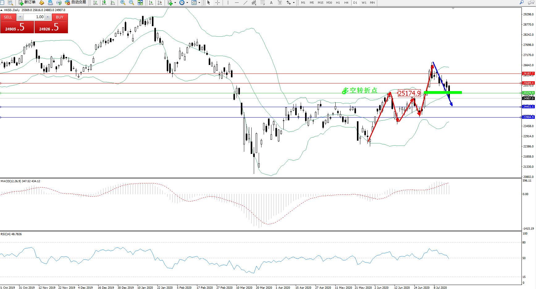 香港恒生指数7月16日(周四)收盘下跌510.89点,跌幅2.00%,报24970.69点;港A股市今日集体走弱,,三大指数全日呈下跌之势。恒指跌2%报24970点失守25000点关口,市场恐慌情绪再起,行业板块近乎全部下挫,半导体股暴跌,中芯国际大跌超25%;大型科网股集体下跌,腾讯大跌5.5%,阿里巴巴跌超4%,京东跌超2%。今日南下资金逆势净流入21.79亿港元,大市成交额为1997亿港元。香港特区政府统计处今日公布,5月香港商品整体出口货量及进口货量分别按年下跌6.7%及11%。总计今年首五个月,香港的商品整体出口货量及进口货量亦分别按年下跌7.3%及9%。