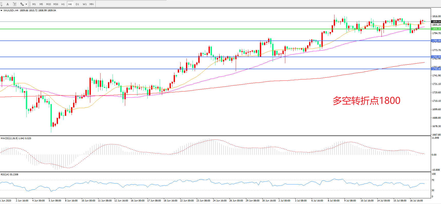 交易策略:在1800.00之上看涨,目标1820.00   1845.00