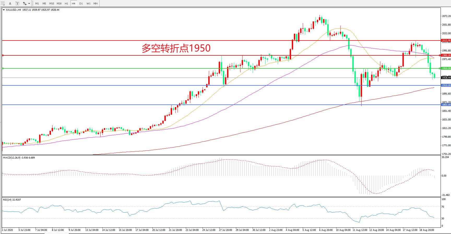 交易策略: 在1950.00之下看跌,目标1910.00   1865.00