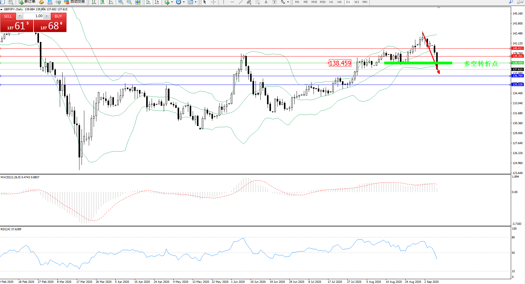 交易策略:138.459下方看跌,目标136.709、135.528