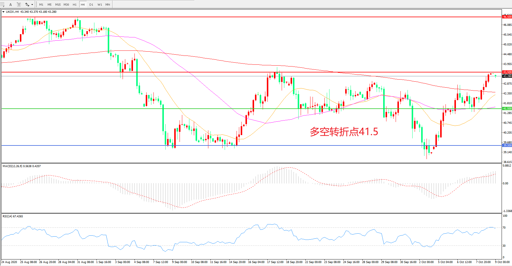 交易策略:  在41.50之上看涨,目标43.50      46.50
