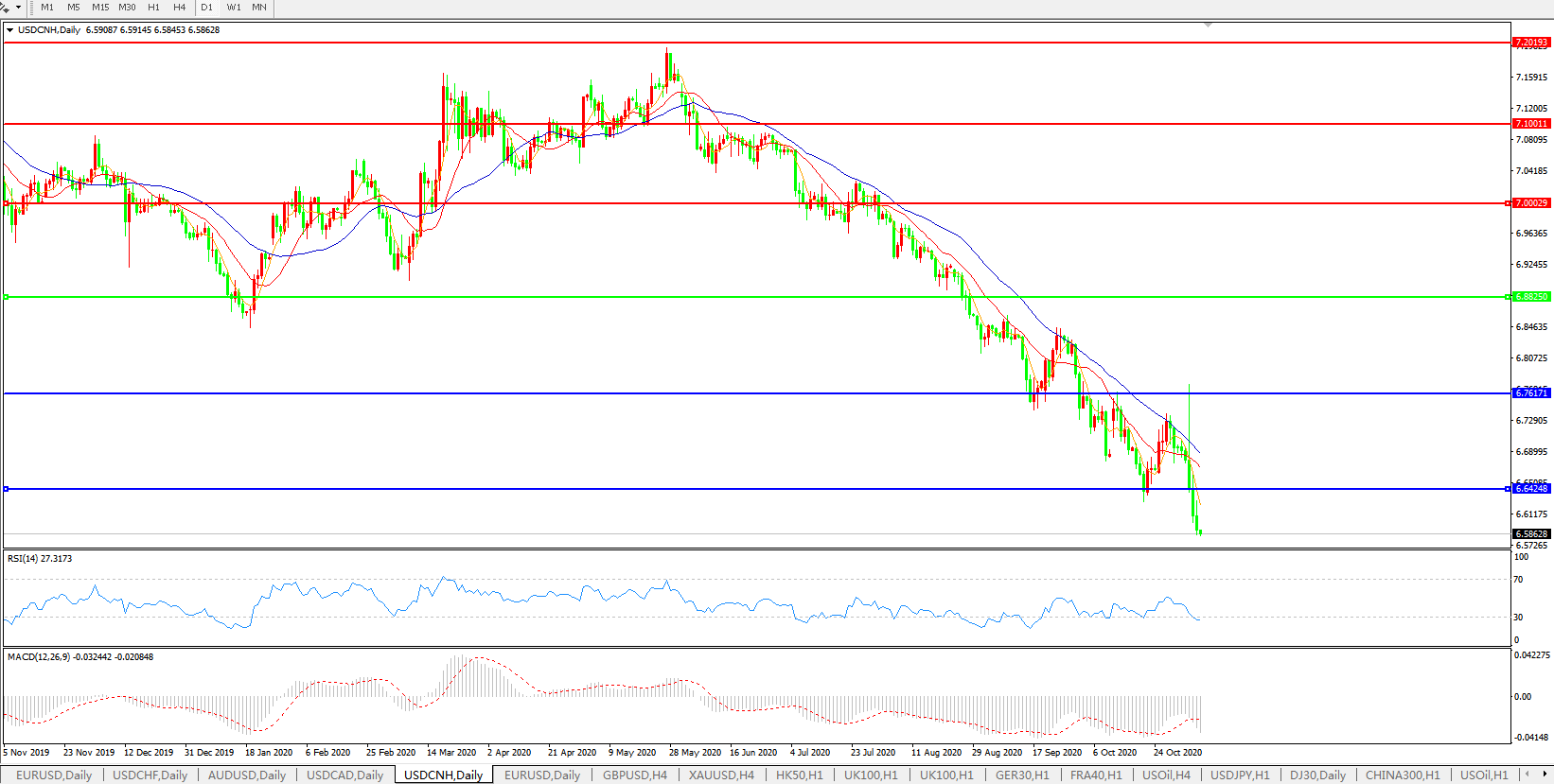 美元兑人民币USDCNH 日线图: