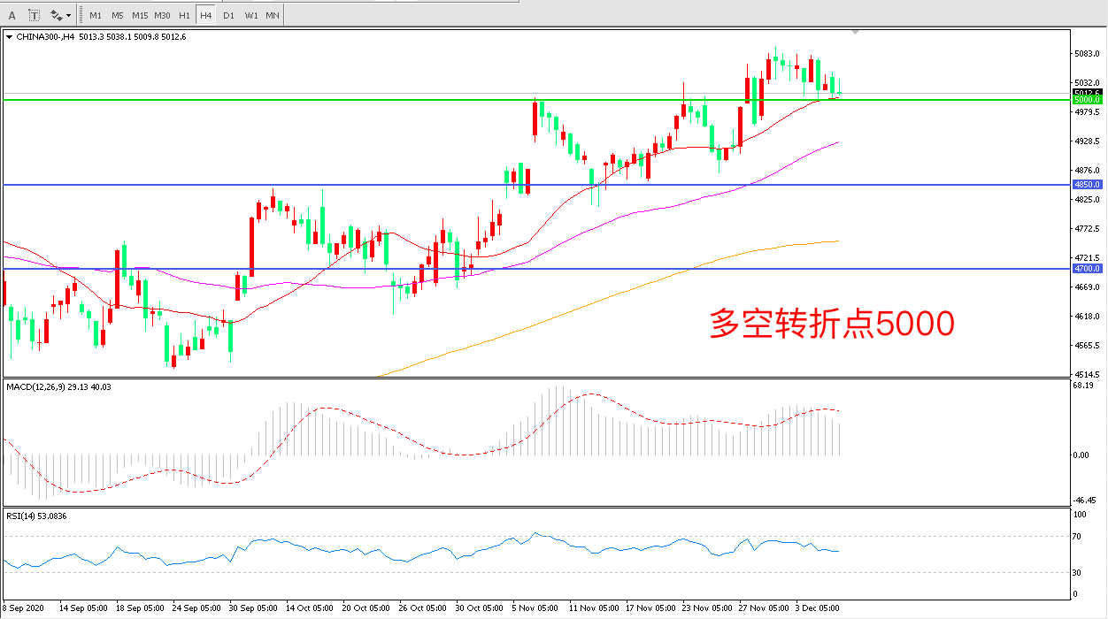 4小时图看,沪深300延续高位震荡,短期走势稍显疲软均线系统依然呈多头排列5000成为下方支撑MACD红柱减少RSI指标走平,日内延续震荡概率较大。