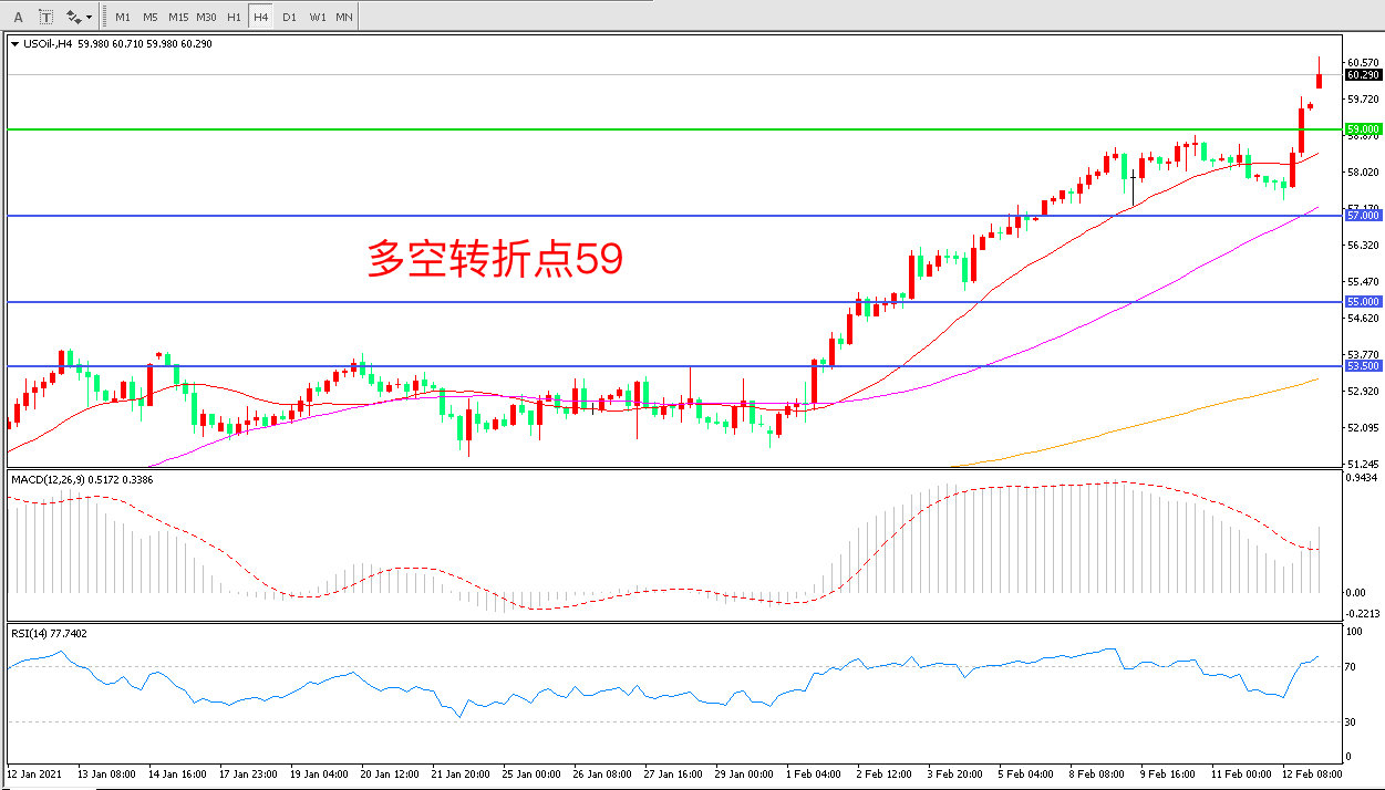4小时图看,油价连续上涨后再度突破,上行趋势十分明显,59美元被顺势突破,行情进入加速阶段,MACD红柱增加,RSI指标向上,日内延续上行概率较大。
