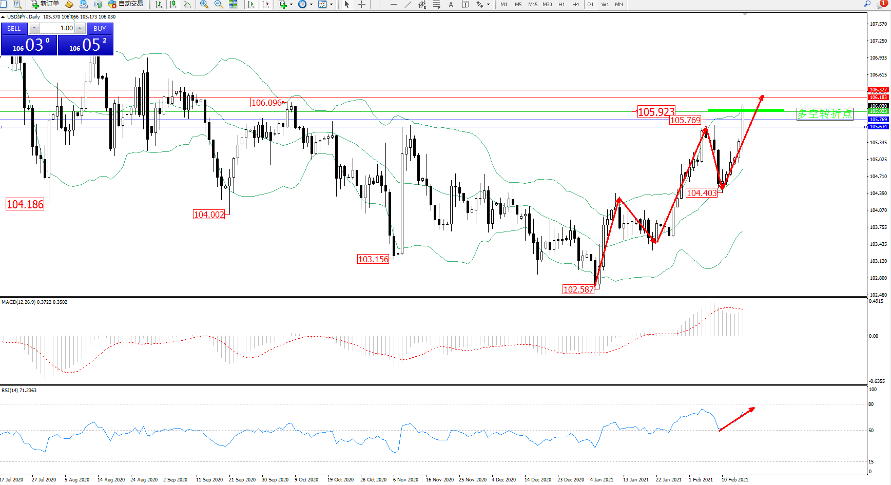 技术点评:多头动力维持在布林带指标通道中上轨区间持续震荡上扬,前期高位106.096位置近在咫尺,有进一步向上破位上行态势,布林带指标上轨附近节点有破位在即,布林带指标呈收口走势后持续向上移动中,多头动力有进一步向上移动态势,MACD指标处于多头区域高位整理平移中,RSI指标处于50均衡线上方持续震荡向上移动中;