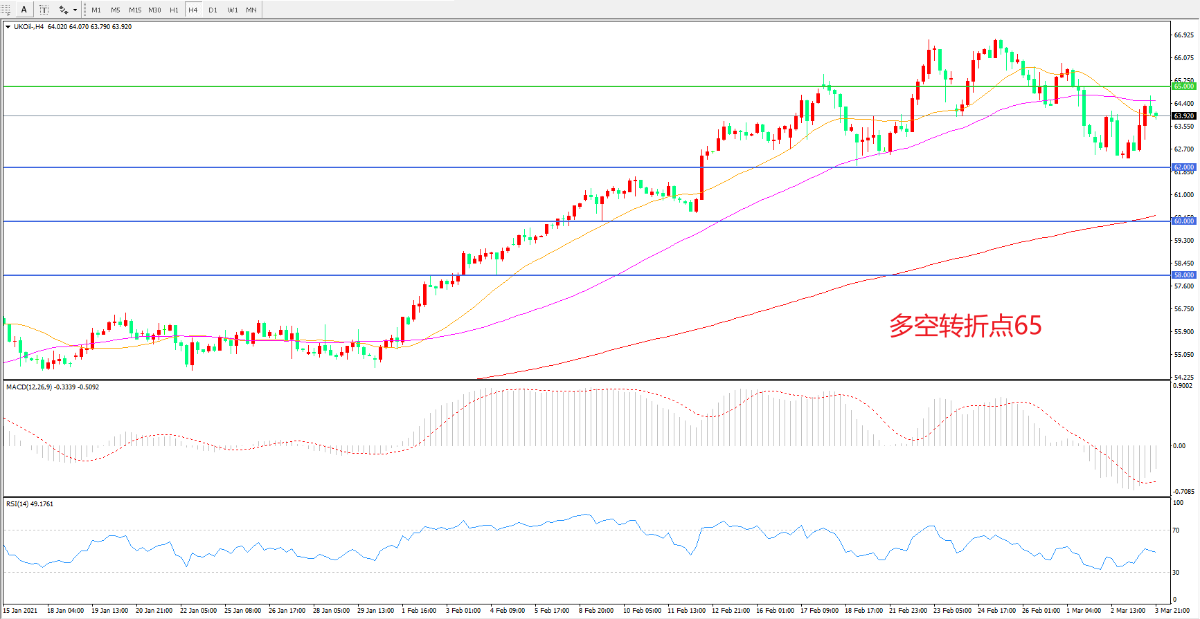 交易策略: 在65.00之下看跌,目标62.00 60.00
