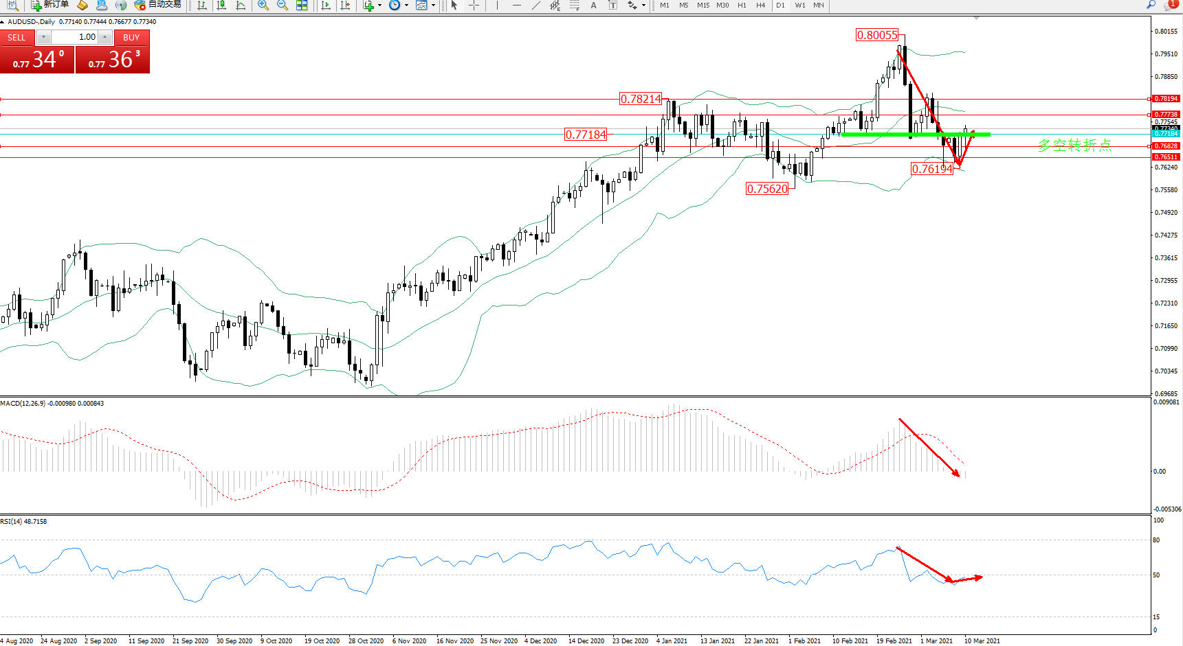 交易策略:0.77184上方看涨,目标0.77738、0.78194