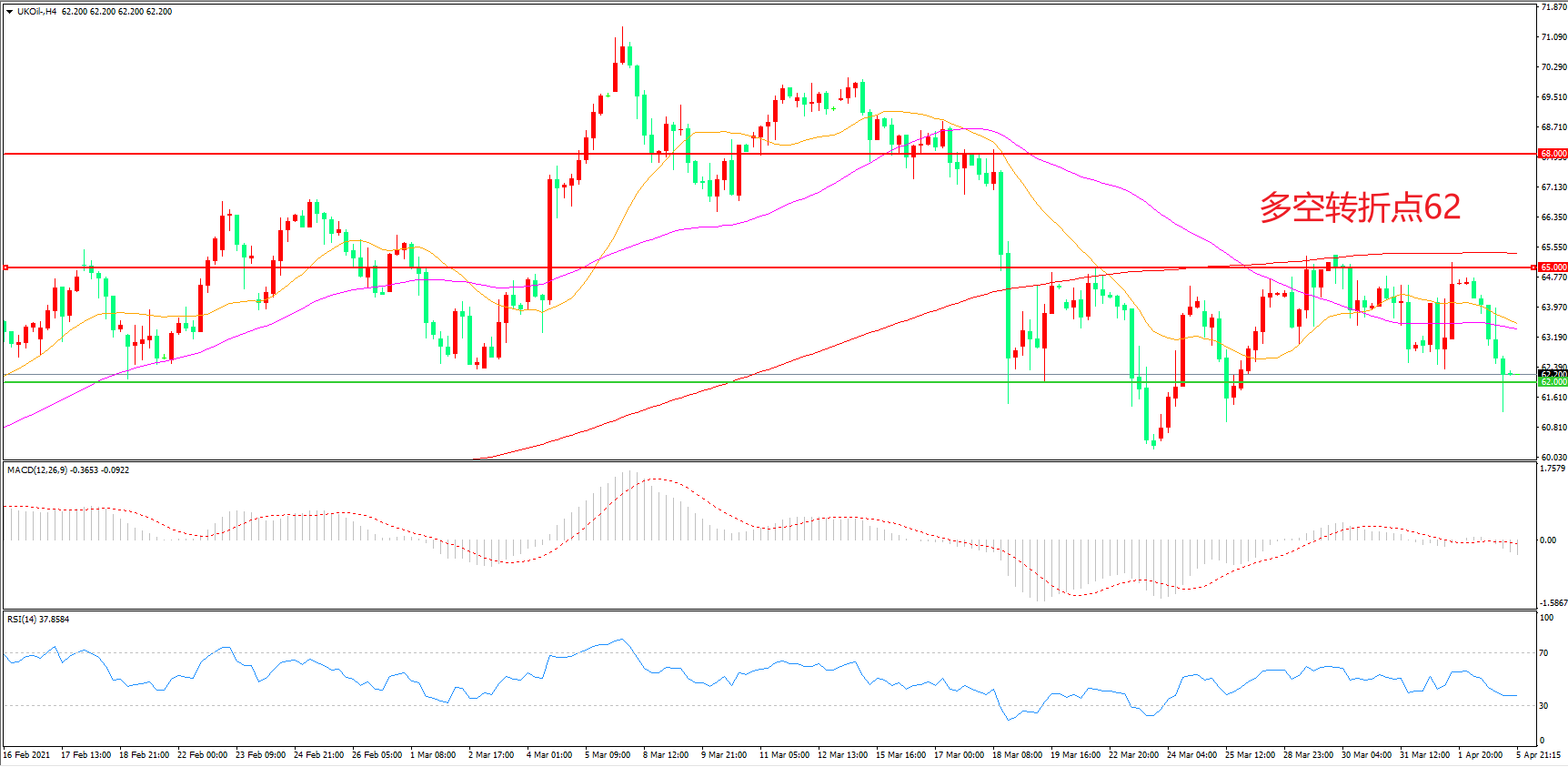 4小时图看,油价长阴下破,跌破前期整理区间,整体表现低迷,均线系统走平,形成上方阻力,62美元成为短期多空分水岭, MACD绿柱增加,RSI指标走平,日内震荡下行概率较大。