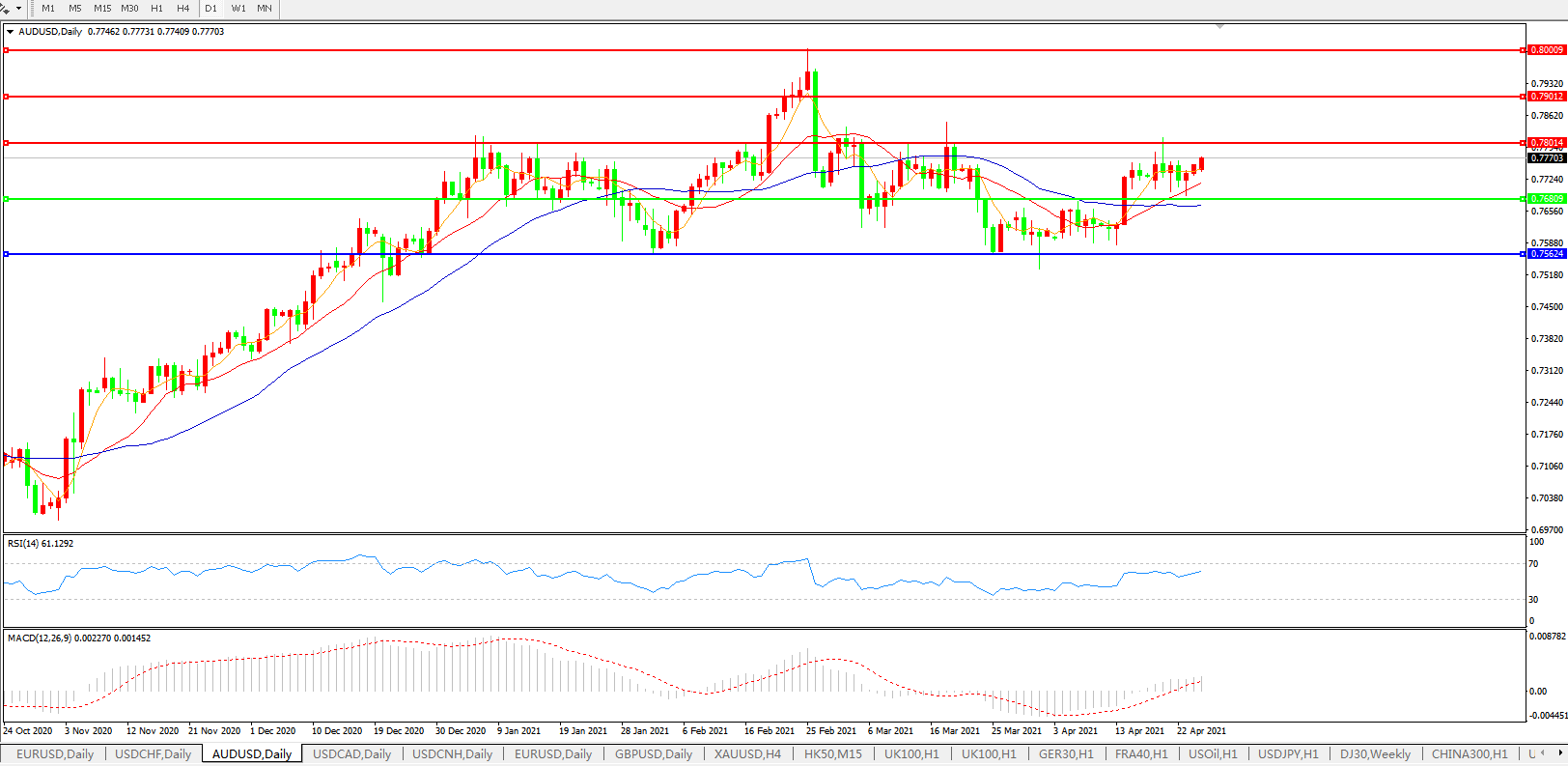 交易策略:0.7680上方看涨,目标0.7800、0.7900
