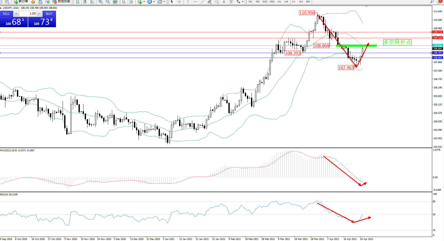 技术点评:高位空头动力延续空头下行走势持续下挫,触及布林带指标下轨附近节点后不断向下移动,空头动力下行至107.463附近得到支撑短暂整理后急速回升,即将触及中轨附近节点,布林带指标呈张口走势后开始缓慢收口中,MACD指标处于0轴线下方空头区域持续震荡后开始有回升迹象,RSI指标处于空头区域整理后急速反转上行,即将突破50均衡线节点;