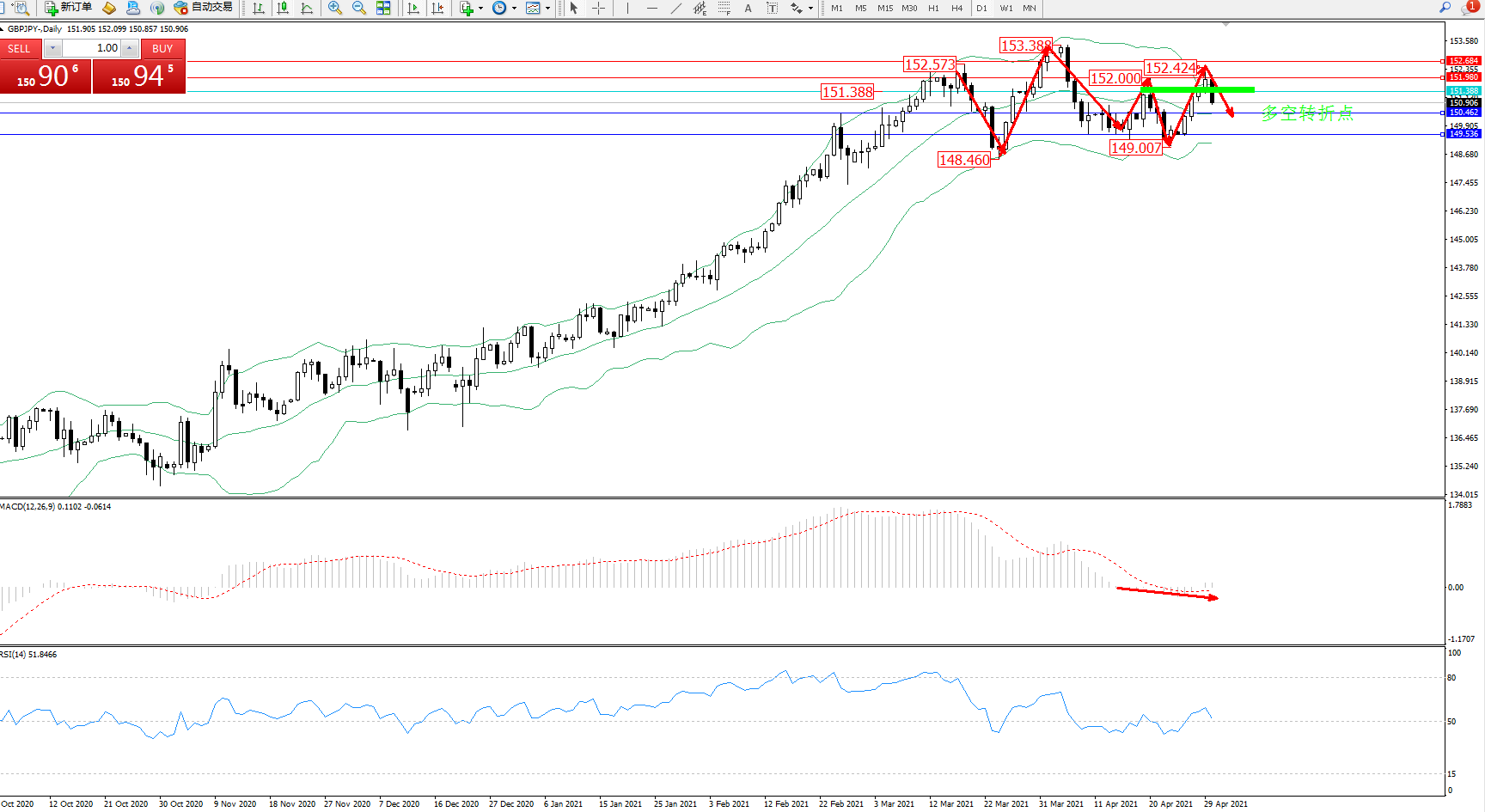 备选策略:151.388上方看涨,目标151.980、152.684