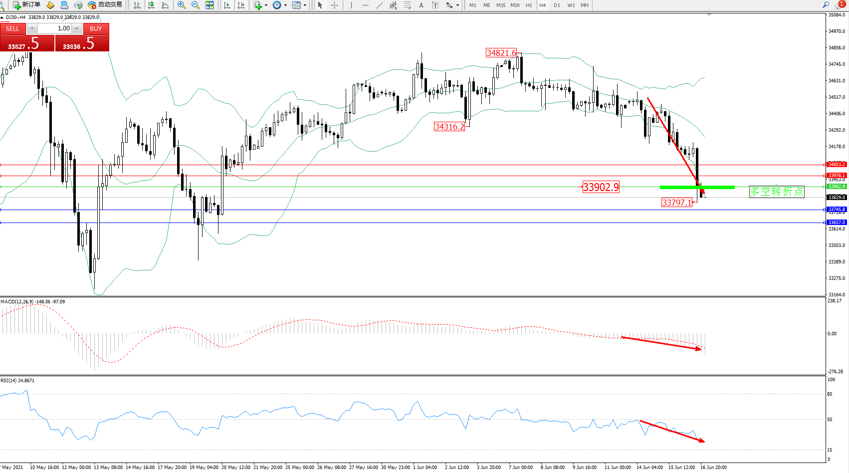 交易策略:33902下方看跌,目标33745、33657