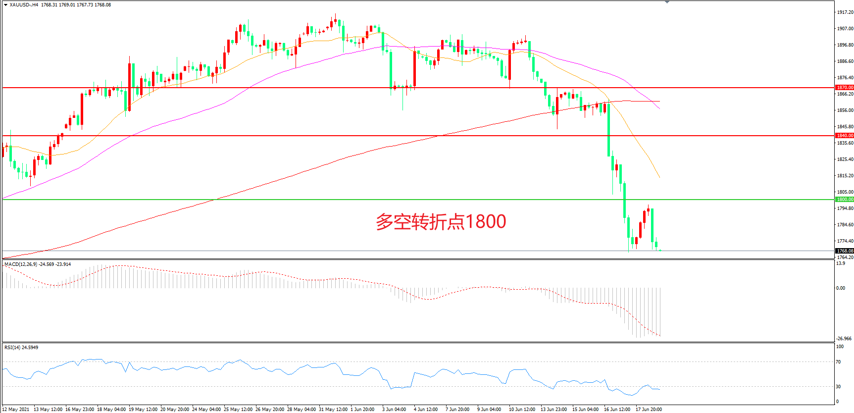 交易策略:在1800.00之下看跌,目标1760.00 1730.00
