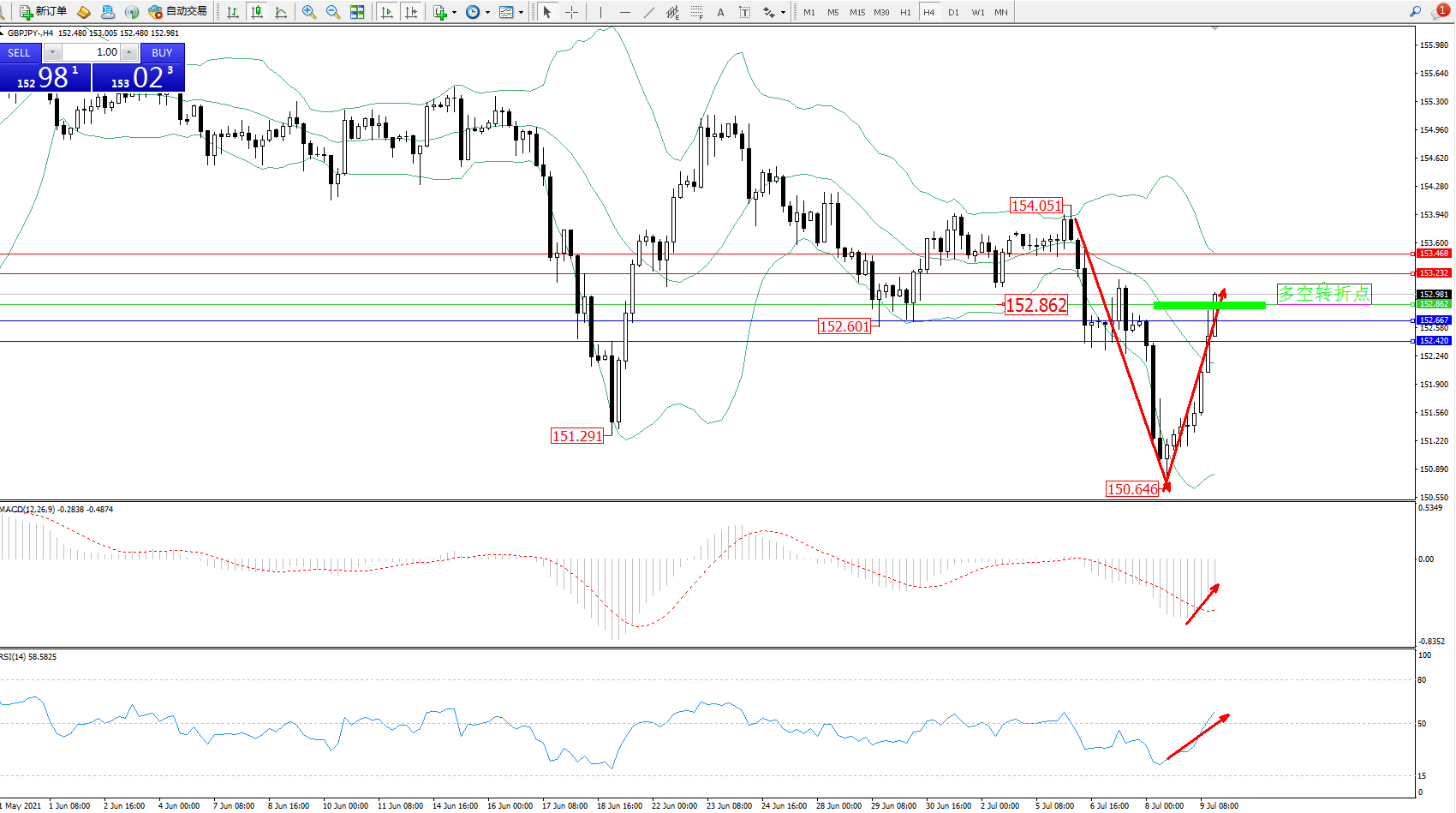 备选策略:152.862下方看跌,目标153.232、153.468