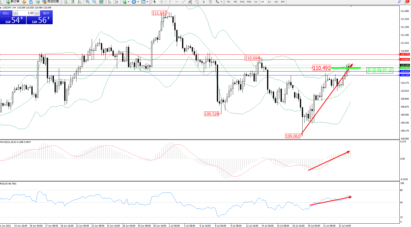 交易策略:110.491上方看涨,目标110.664、110.770
