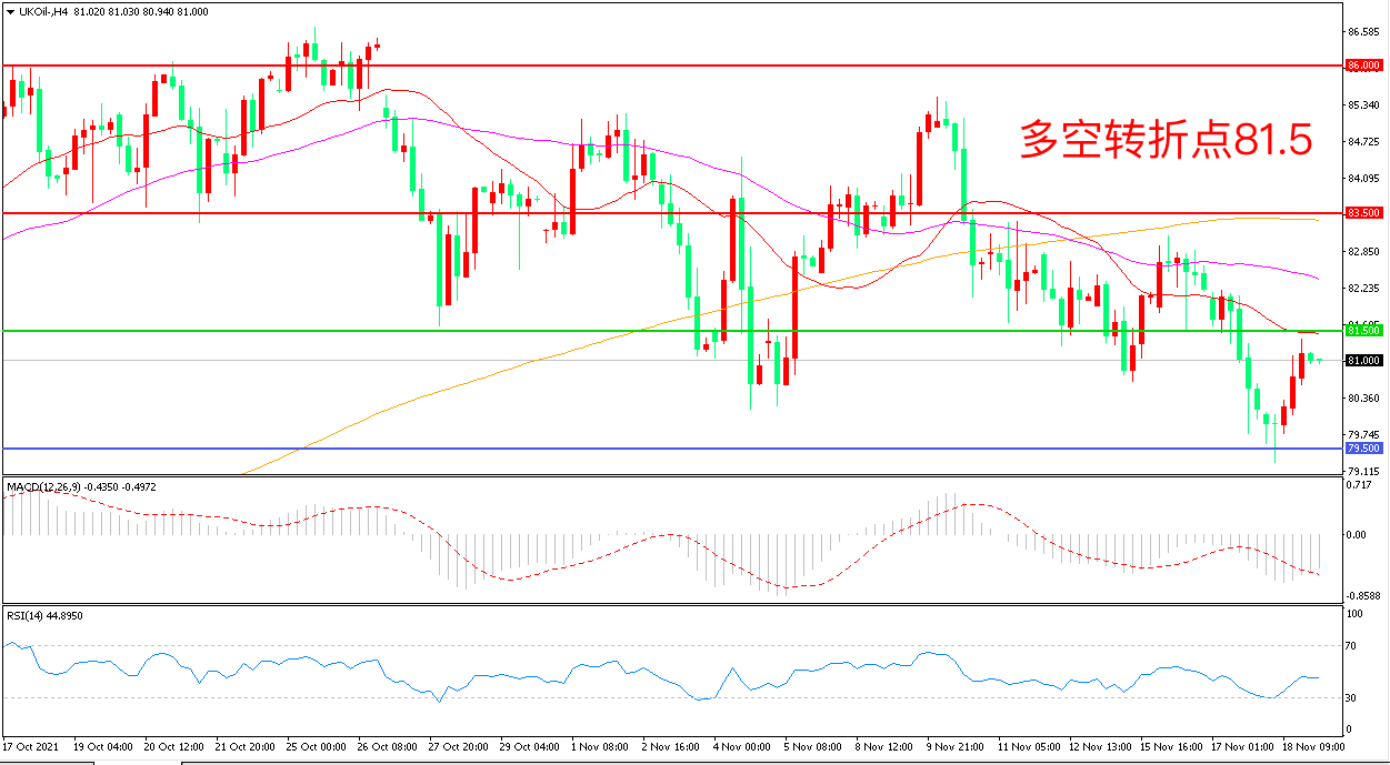 4小时图看,油价连续下跌后大幅拉升,短期走势有所回暖,但整体仍然处于空头形态制作,81.5美元成为多空分水岭,MACD绿柱缩短,RSI指标走平,日内震荡下行概率较大。